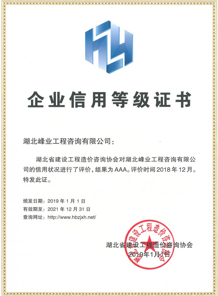 公司擁有強大的技術、管理、服務力量,在發展過程中不斷加強公司制度化、規范化、標準化建設,恪守“以質量求生存”“以信譽求發展”,我們堅持獨立、公正、科學的原則,恪守職業道德,嚴謹工作。一份耕耘一份收獲, 2010年公司榮獲湖北省建設廳“先進造價咨詢單位”稱號;2011、2013年連續兩次榮獲湖北省工程造價咨詢企業AAAA信用等級;2010、2011、2012連續三個年度榮獲武漢市工商行政管理局“守合同重信用企業”稱號。